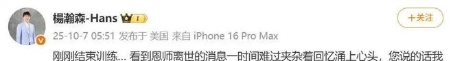 16. “刚结束一天的训练,看到恩师离开的消息,心头瞬间被回忆和悲伤填满。您说过的话我一直铭记在心,感谢您一路的引领与教诲。”