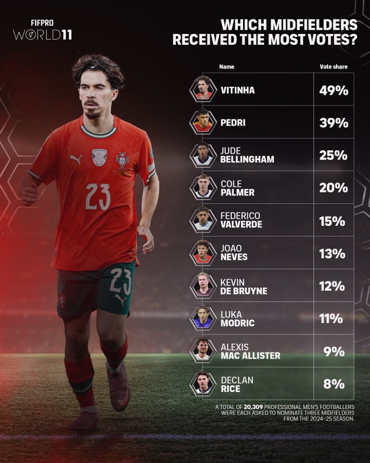 FIFPRO年度最佳中场投票细节:贝林厄姆25%第三 赖斯8%第十