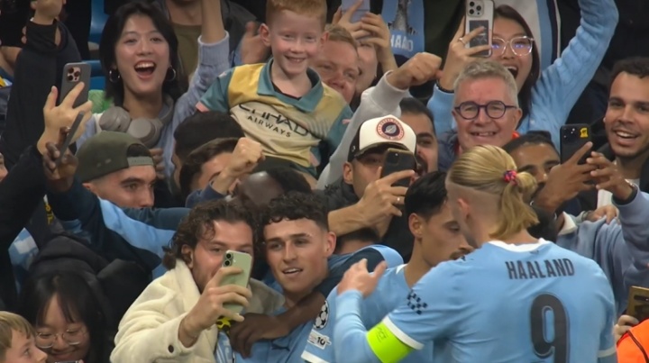 11月06日讯 欧冠联赛阶段第4轮曼城vs多特第22分钟,福登进球后跑到角旗区庆祝,有球迷搂着他自拍了一张,福登还看镜头笑的特别配合。